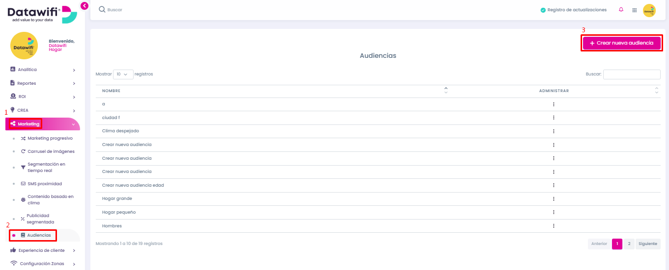 En la parte izquierda de la pantalla selección de la operación Marketing -Audiencias y despues dirigirse a +Crear audiencia como se muestra una continuación: