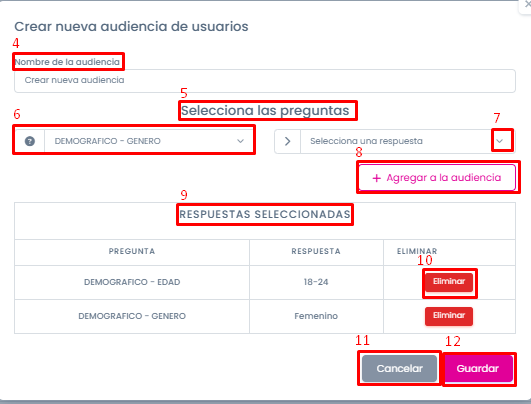 7 | Respuestas | En ese espacio se visualizan las opciones de respuesta disponibles para el análisis de la audiencia. |