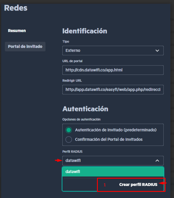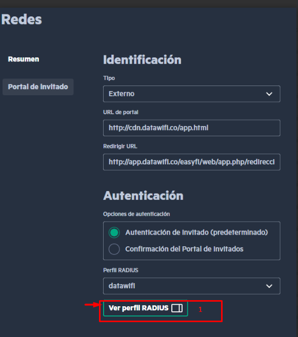 En este paso se accede al perfil RADIUS para validar o configurar el servidor de autenticación que utilizará el portal de invitados.