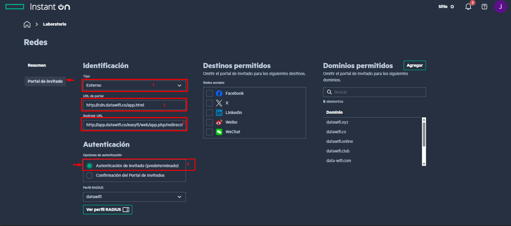 En este paso se configura el portal cautivo externo que se utilizará para la autenticación de los usuarios invitados.