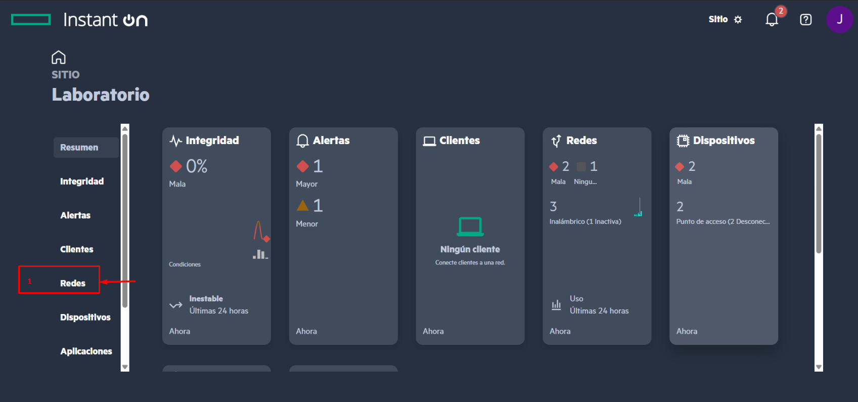 En este paso se accede al menú de redes del sistema Aruba Instant, desde donde se realizará la creación y configuración de las redes inalámbricas.