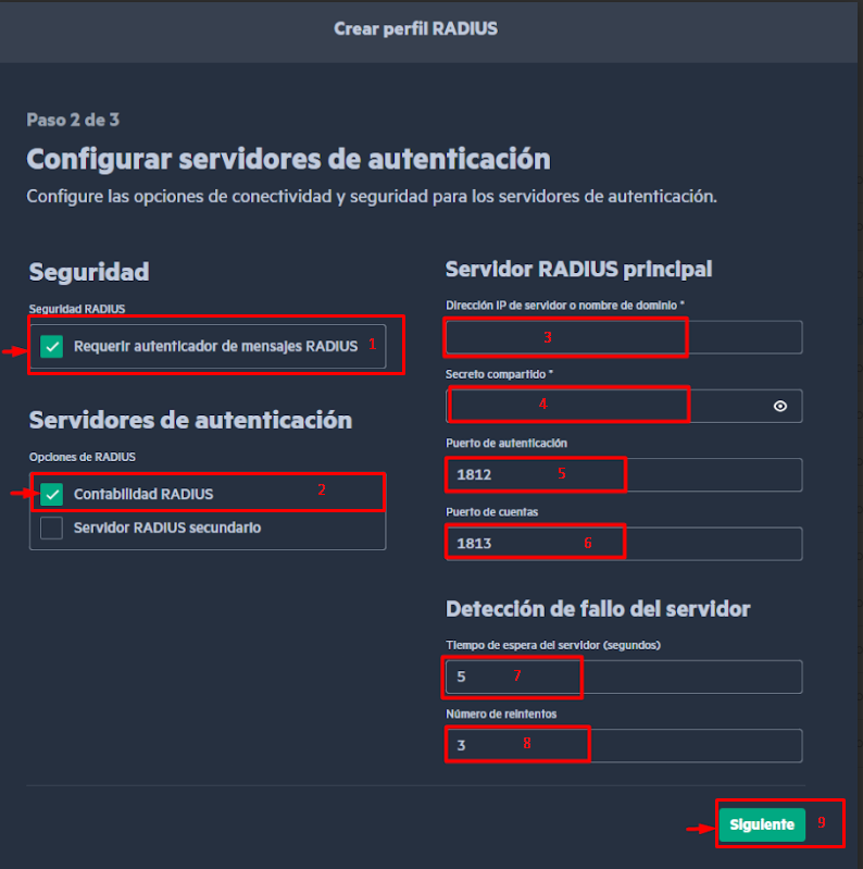 En este paso se configuran los parámetros de seguridad y conexión del servidor RADIUS que se usará para la autenticación de los usuarios.