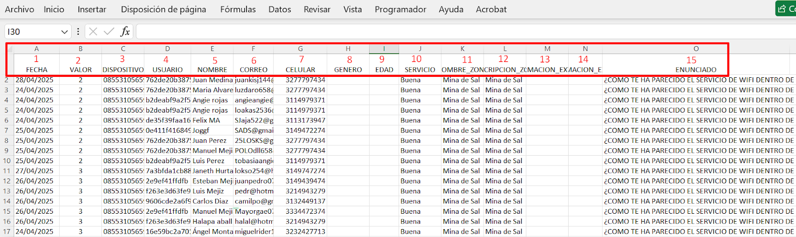 1 | Fecha | Allí registra la fecha donde se realizó la conexión a la zona y calificación del servicio. |