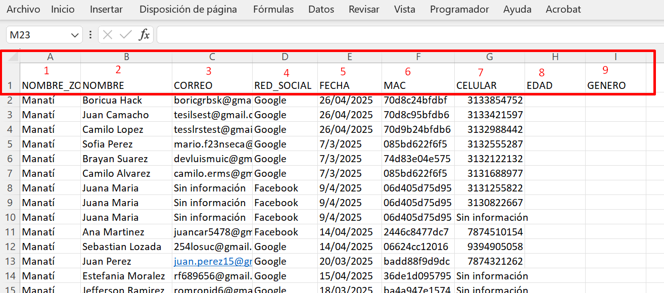 Al seleccionar la opción de Exportar, se realizará la descarga de un archivo en .csv, el cual contiene los datos que se muestran a continuación: