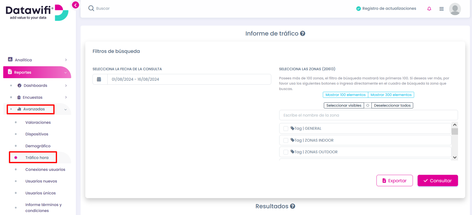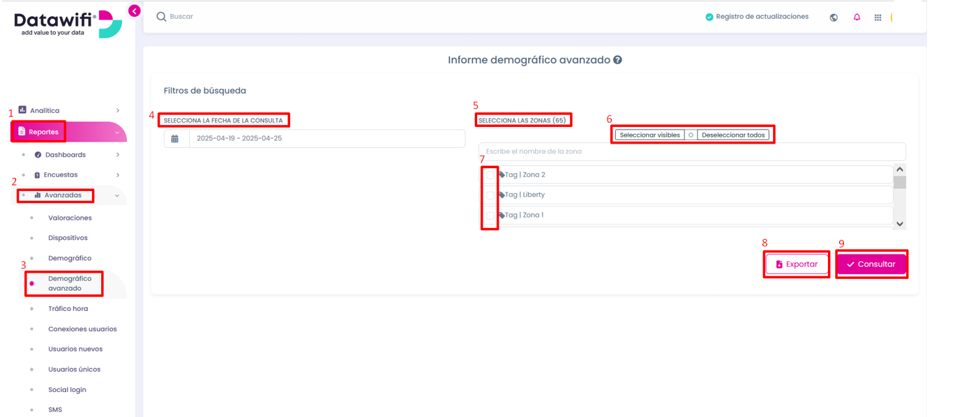 5 | Selecciona las zonas | Allí se puede seleccionar la zona o las zonas en las que se desea consultar la información. |