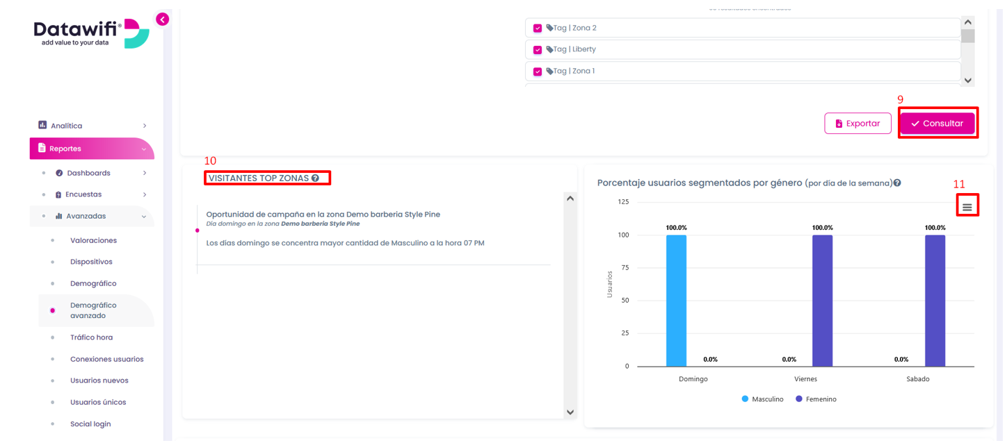 Al acceder a la opción de consulta, se muestra la siguiente gráfica, en la que se visualizan los porcentajes de usuarios segmentados por género y por día de la semana.