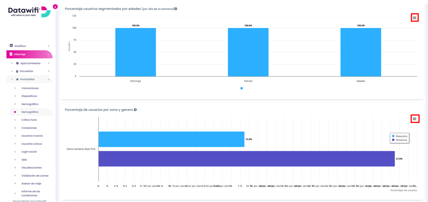 Al desplazarse hacia la parte inferior de la pantalla, se puede ver la siguiente imagen, que continúa mostrando las gráficas con el porcentaje de usuarios segmentados por edades (por día de la semana) y el porcentaje de usuarios por zona y género.