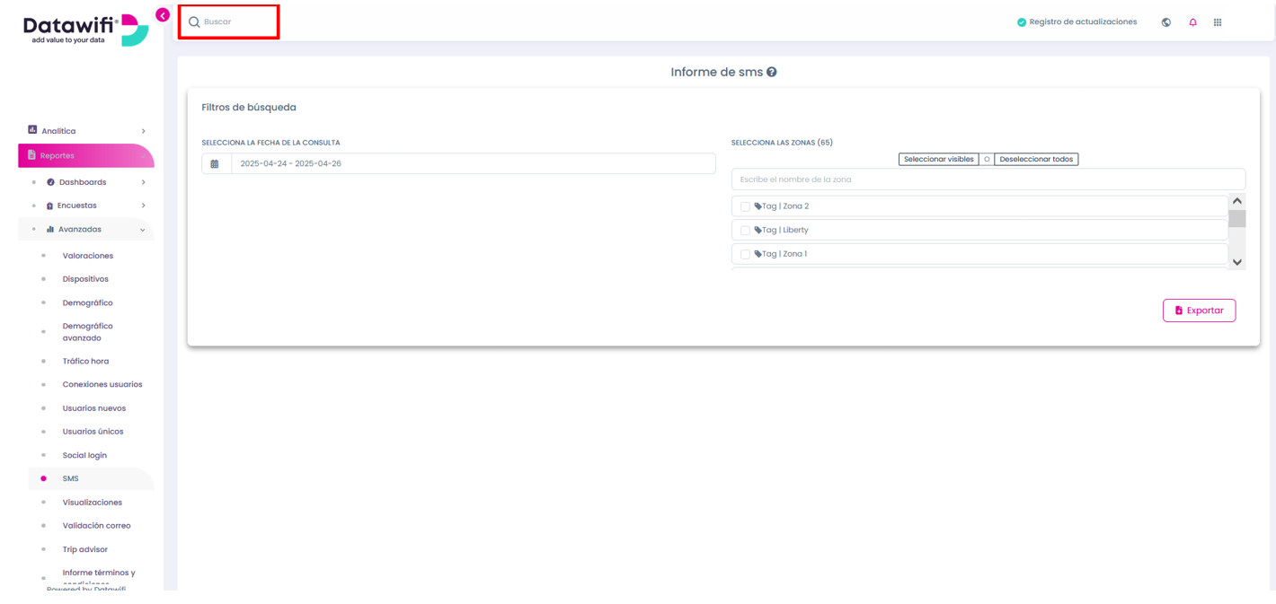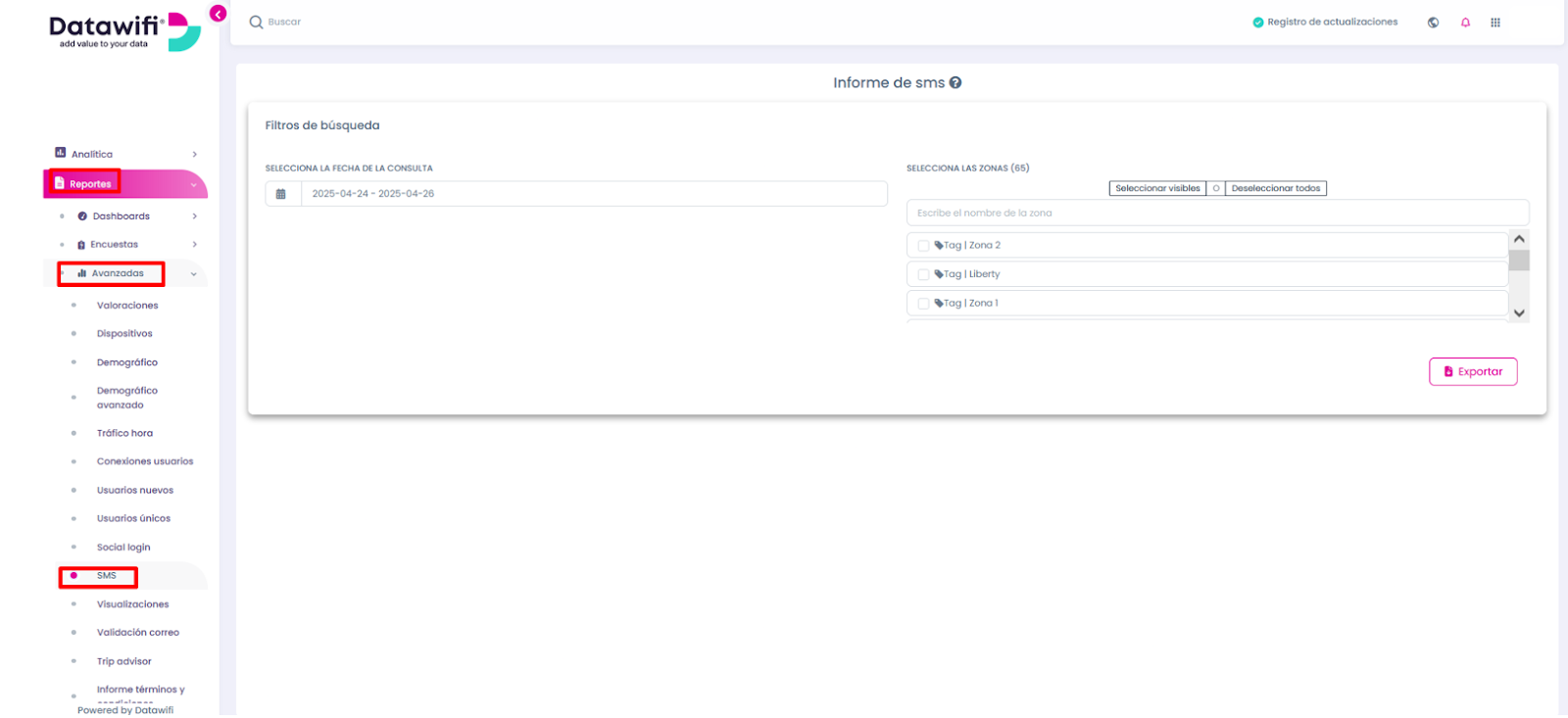 En la parte izquierda de la pantalla selecciona la opción Reportes - avanzada y después dirígete a SMS como se muestra a continuación: