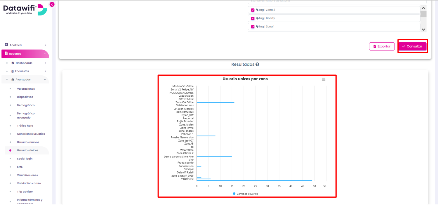 Este gráfico de barras, te mostrará la cantidad de usuarios únicos (Mac únicas) que hay por zona dentro del rango de fecha a consultar, adicional se mostrará una última columna de usuarios únicos (Mac únicas) por la cuenta general dentro de la fecha de consulta seleccionada.