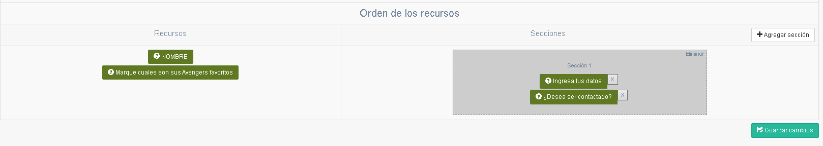 Se debe ubicar la pregunta en el cuadro de SECCIONES y dar clic en guardar cambios.
